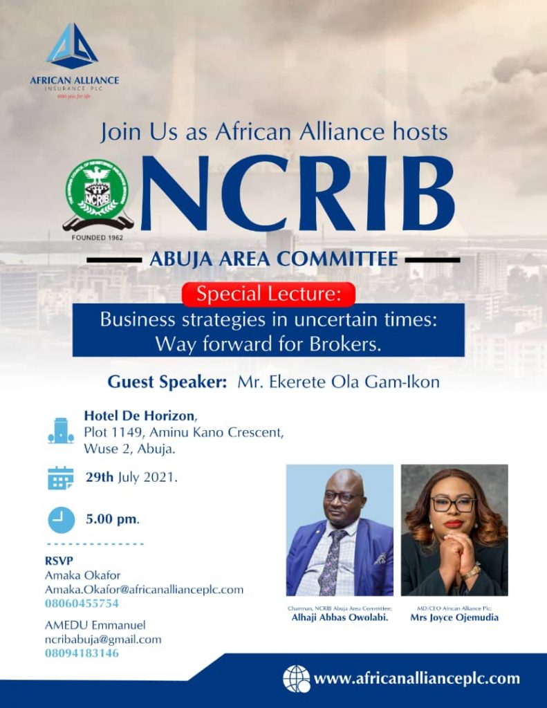 The meeting will feature a special lecture on “Business Strategies in Uncertain Times: Way Forward for Brokers” to be delivered by leading Insurance expert and finance guru, Mr. Ekerete Ola Gam-Ikon. Recall that earlier in the year, African Alliance had hosted the first meeting of the general NCRIB in Lagos.