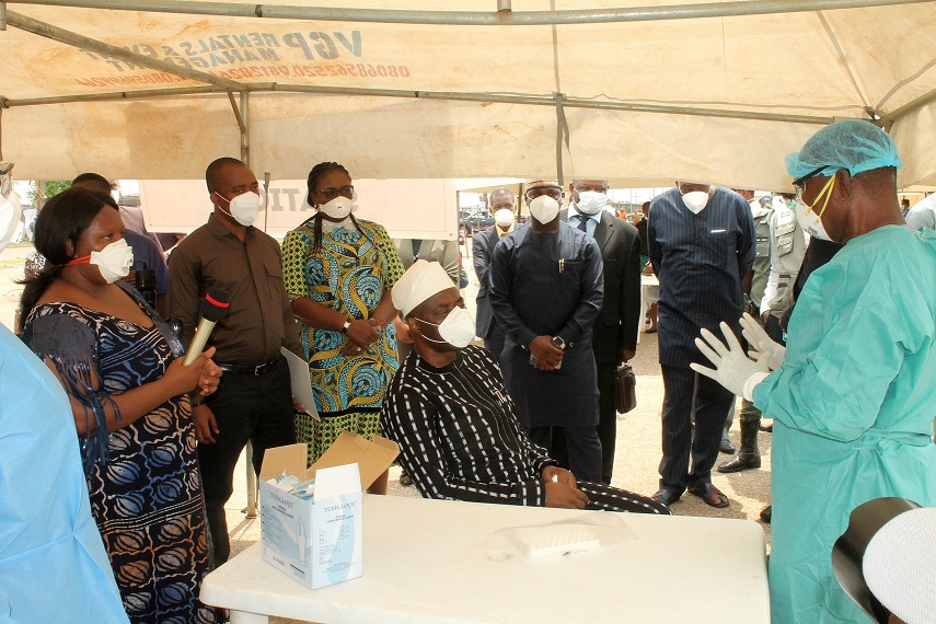 > 1: Oyo State Governor, Engr Seyi Makinde (sitting) and others during the flag-off of Oyo State Drive Through and Walk Through Covid-19 Community Testing Centre at Lekan Salami Sports complex, Adamasigba, Ibadan. PHOTO: Oyo State Government.