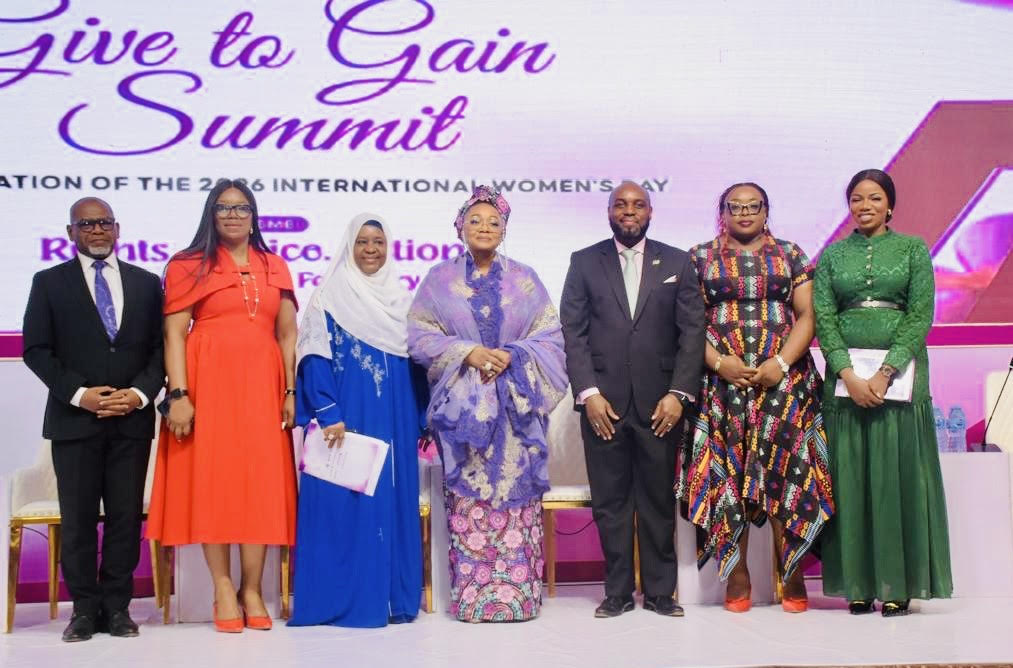 Left to Right Executive Commissioner Operations Securities and Exchange Commission Mr. Bola Ajomale, MD KudiMata Mrs. Kathleen Erhimu, Executive Commissioner Corporate Services SEC, Mrs. Samiya Usman, Minister of Women Affairs and Social Development, Hajiya Imaan Sulaiman-Ibrahim CEO NGX Regulation Limited Mr. Olufemi Shobanjo, Ag. mD Meristem Registrars Mrs. Nkechiyelu Okoye and CEO FinTribe Jennifer Awirigwe at the grand finale of the “Give to Gain” Summit to mark the 2026 International Women’s Month in Abuja, Monday